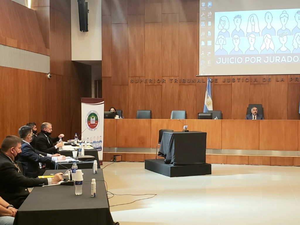 A la izquierda del juez Vírgala y en el otro extremo del salón del Stjer, para respetar las medidas sanitarias, se ubicaron los 12 jurados titulares y tres suplentes, ya que una jurado no logró llegar a tiempo.