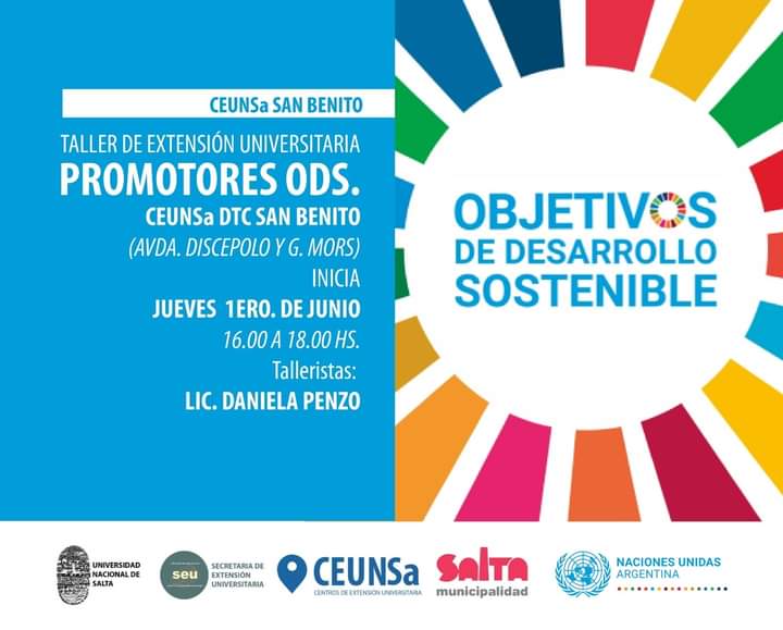 Desde la Secretaría de Extensión de la UNSa informan que están abiertas las inscripciones para el Taller de Promotores de Objetivos de Desarrollo Sostenible ODS que se desarrollará en el CEUNSa DTC San Benito. Esta propuesta arranca el 1 de junio y cuenta con el apoyo de Naciones Unidas Argentina.