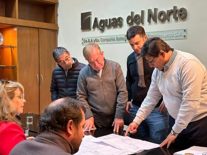 El Intendente Daniel Moreno de Vaqueros junto al presidente Ignacio Jarsún, Ingeniero Javier Jurado y el Gerente en Servicio Juan Alberto Bazan, mantuvieron una reunion informativa con los vecinos de Lesser, donde se dieron a conocer detalles del avance de obra de aguas del norte que está en ejecución para mejorar el servicio en la zona.