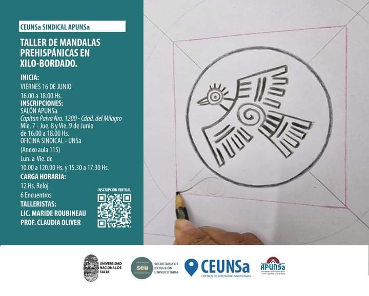 La Universidad Nacional de Salta informa que hoy 21 de Julio continúa el Taller Mandalas Prehispanicos en xilo- bordado en la Sede Sindical APUNSa ubicado en calle Capitan Paiva 1200 en Barrio Ciudad del Milagro de 16 a 18 y 30 hs.
