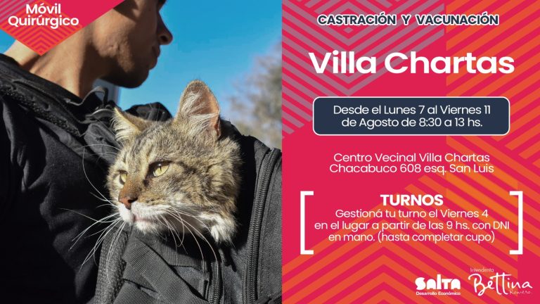 El equipo veterinario se trasladará, la semana entrante, con el Móvil Quirúrgico al centro vecinal de Villa Chartas, ubicado en Chacabuco 608 esquina San Luis. La atención se brindará desde el lunes 7 al viernes 11 de agosto en el horario habitual de 8:30 a 13.