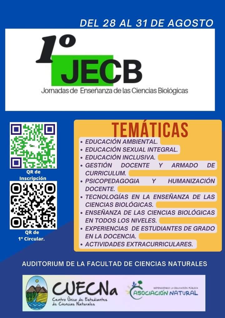 La Universidad Nacional de Salta informa a la comunidad que se realizará las 1° jornadas de la enseñanza de las ciencias Biológicas (JECB). La jornada iniciará el 28 de agosto y finalizará el 31 de agosto del corriente año.
