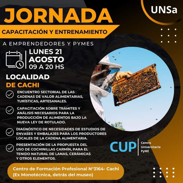 Este lunes, 21 de agosto, la Universidad Nacional de Salta brindará una Jornada de capacitación y entrenamiento a emprendedores y Pymes en la localidad de Cachi. Esto se desarrollará como parte del Centro Universitario Pyme que funciona en el Centro de Formación Profesional N° 3164 de Cachi también conocido como la Ex Monotécnica ubicada atrás del Museo.