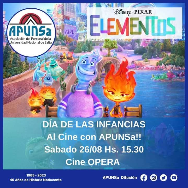 La Universidad Nacional de Salta y APUNSa invitan a HIJOS E HIJAS DE AFILIADAS/OS a participar de una función de cine. La actividad se realizará el día Sábado 26 de Agosto a 15:30 hs. en el Cine Opera, Urquiza Nº 560, con la proyección de la película “Elementos”.