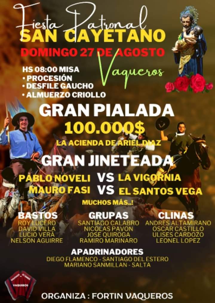 La municipalidad de Vaqueros invita a la comunidad y alrededores a festejar este domingo 27 de agosto La Fiesta Patronal de San Cayetano.