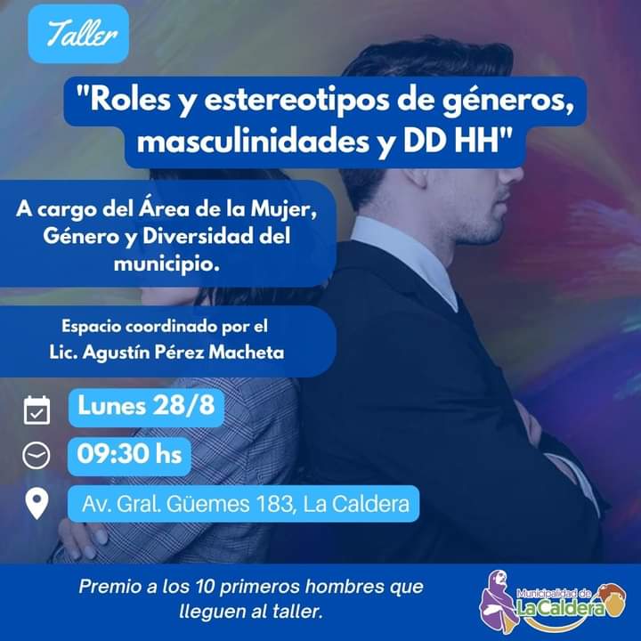 La municipalidad de la Caldera informa a la comunidad que se realizará un taller llamado “Roles y estereotipos de géneros, masculinidades y DD HH”. La capacitación se llevara a cabo el día 28 de agosto de 9:30 hs. En Av. Gral. Güemes 183, La Caldera.
