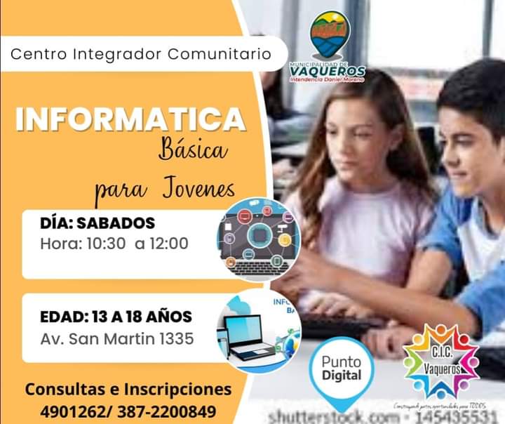 - Informática Básica para Jovenes, se realizará los días sábados de 10:30 a 12:00 hs. Edad: 13 A 18 años