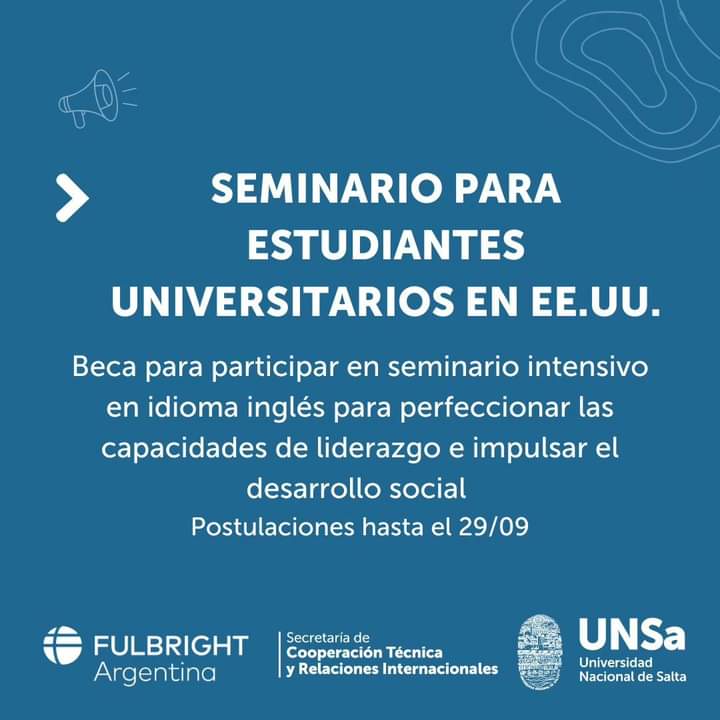 La Secretaría de Cooperación Técnica y Relaciones Internacionales informa que se abrió la convocatoria para el Seminario para estudiantes Universitarios en EEUU. Este busca brindar a jóvenes estudiantes la oportunidad de participar en un seminario intensivo en idioma inglés para perfeccionar las capacidades de liderazgo de los participantes y desarrollar el espíritu emprendedor para impulsar el desarrollo social. Los seleccionados compartirán el seminario con jóvenes de Chile, Uruguay y Brasil.