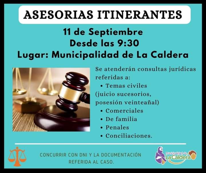 El 11 de septiembre desde las 9:30 en la Municipalidad de La Caldera se atenderán consultas jurídicas referidas a Temas civiles (juicio sucesorios, posesión veinteañal), Comerciales, De familia, Penales, Conciliaciones y demás temas.