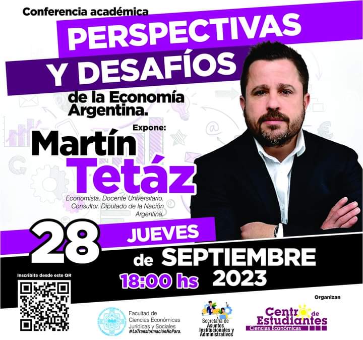 La presente conferencia estará a cargo del Lic. Martín Tetaz quien es economista, docente universitario, consultor y diputado de la Nación Argentina y está promovida en conjunto a la Secretaría de Asuntos Institucionales y Administrativos de la Facultad de Cs. Económicas.