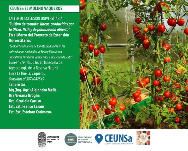La actividad se desarrollará como parte del Centro de Extensión Universitario de la Biblioteca Popular El Molino Vaqueros y, particularmente, del Proyecto de Extensión universitaria “Compartiendo líneas de tomate producidos en las Universidades Nacionales de Salta y Rosario con agricultores familiares, campesinos e indígenas de Salta”.