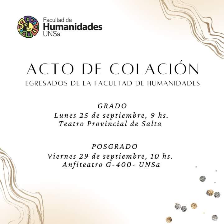 La Facultad de Humanidades de la Universidad Nacional de Salta invita a la comunidad al acto de colación de grado y posgrado el próximo lunes 25 y viernes 29 de septiembre.