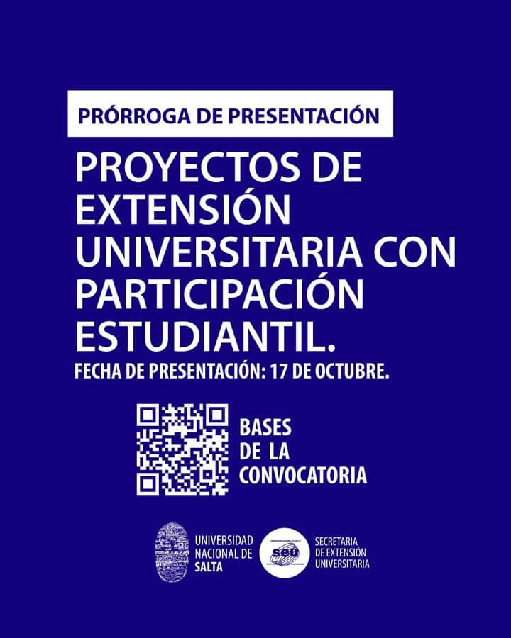 La Secretaría de Extensión de la UNSa informa que se ha prorrogado la presentación de propuestas en la Decimoséptima Convocatoria de Proyectos de Extensión Universitaria con Participación Estudiantil hasta el día martes 17 de octubre de 2023.