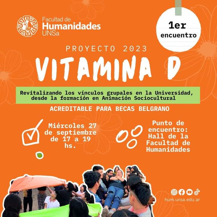 La Facultad de Humanidades invita a participar del proyecto “Vitamina D”, encuentros/ talleres con inscripción abierta a estudiantes, egresadxs, docentes y PAU, donde cada participante experimentará en torno a la afectividad y la pedagogía de los cuidados, actividades colaborativas para el desarrollo de habilidades grupales de escucha activa, desde la metodología de la Animación Sociocultural.