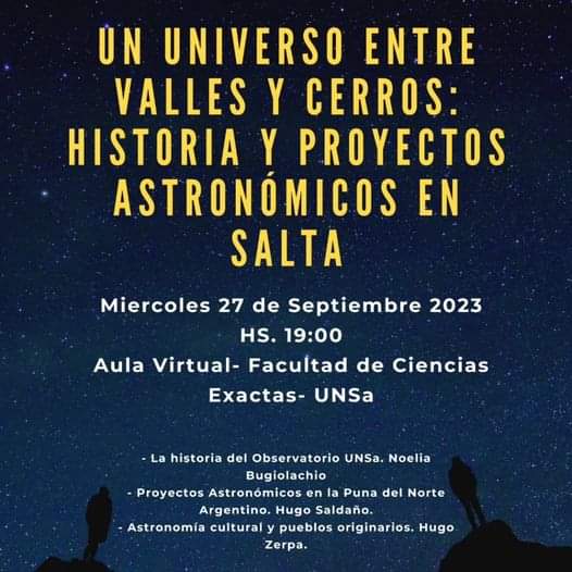 La charla comenzó a las 19:00 horas, y se conoció la historia del Observatorio Astronómico UNSa a cargo de la Prof. Noelia Bugilachio, los proyectos astronómicos en la puna salteña a cargo del Dr. Hugo Saldaño y algunas interpretaciones de nuestro cielo por parte de las comunidades andinas a cargo de Dip. Hugo Zerpa.