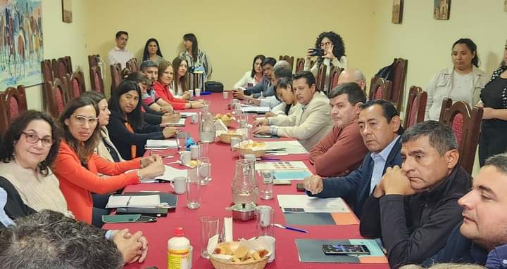 El Presidente del Foro de Intendentes Daniel Moreno junto a 7 Intendentes se reunieron con el equipo de MUNA de UNICEF Fernanda Potenza, Carlos Morelo rector de UPATecO, Cora Pfister coordinadora académica UPATecO, Liliana Chaile, Juan Paredes, Constanza Figueroa Secretaria de Relaciones Institucionales e Internacionales, y la Ministra de Desarrollo Social Silvina Vargas