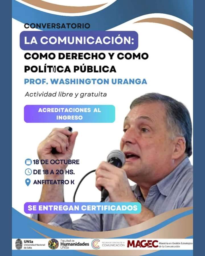 La Escuela de Ciencias de la Comunicación de la Universidad Nacional de Salta invita a participar de la charla “Comunicación, derecho y política pública” que brindará Washington Uranga en la UNSa.