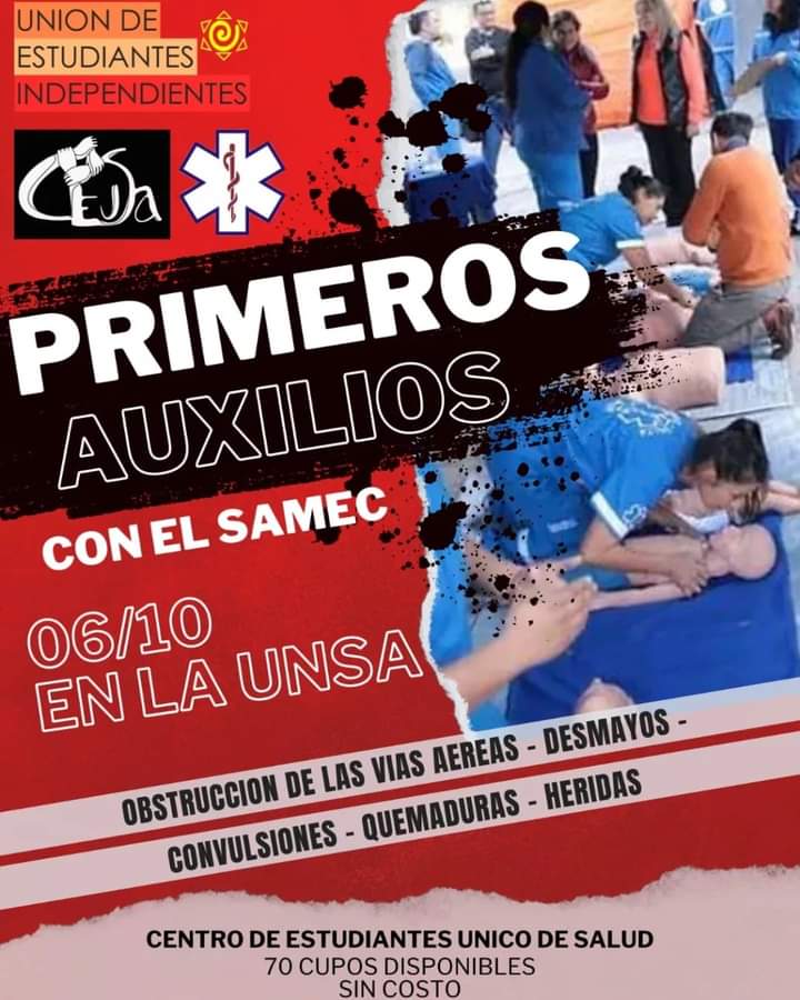 El Centro de Estudiantes Único de Salud  de la Universidad Nacional de Salta comparte información sobre la capacitación de Primeros Auxilios a cargo del personal del SAMEC. El curso se realizará el día Viernes 6 de Octubre a las 9 am.