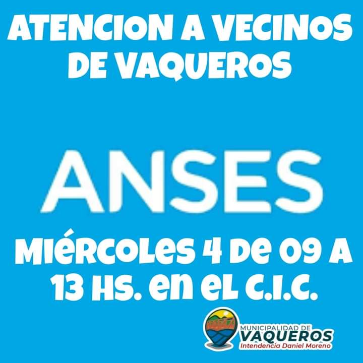 La municipalidad de Vaqueros informa a la comunidad que la Oficina de Anses atenderá el día Miercoles 04 de octubre a partir de las 09:00 horas en el centro Integrador del municipio.