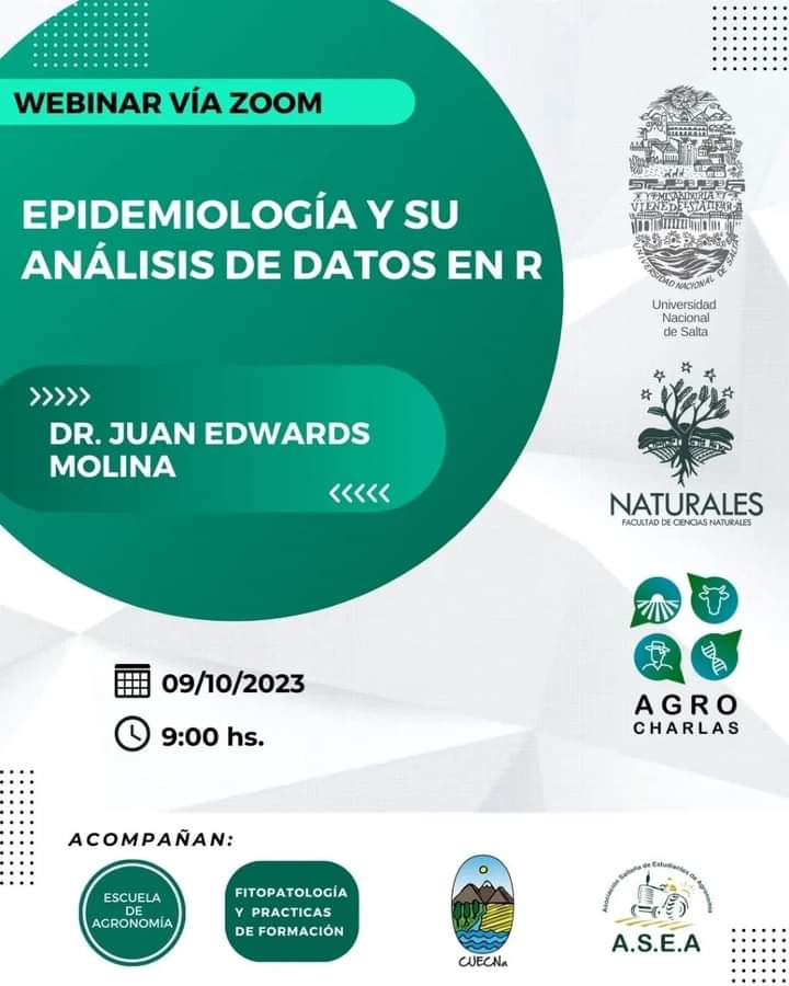 La Facultad de Cs. Naturales de la Universidad Nacional de Salta y Agrocharlas anuncian el nuevo webinar “Epidemiología y su análisis de datos en R” a cargo del Dr. Juan Edwards Molina.
