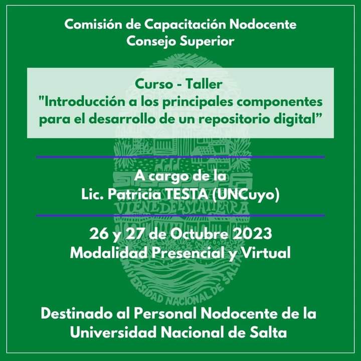APUNSa y La Comisión de Capacitación Nodocente del Consejo Superior de la Universidad Nacional de Salta informan que los días 26 y 27 de Octubre de 2023, se llevará a cabo el Curso – Taller “Introducción a los principales componentes para el desarrollo de un repositorio digital”, a cargo de la Lic. Patricia Testa de la Universidad Nacional de Cuyo. La actividad se llevará a cabo en las Aulas Norte de la universidad de 10:00 a 13:00 horas.