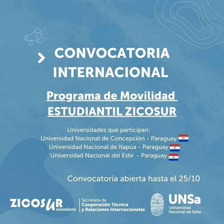 La Secretaría de Cooperación Técnica y Relaciones Internacionales de la Universidad Nacional de Salta anuncia la apertura a las convocatorias para la movilidad internacional estudiantil del programa ZICOSUR