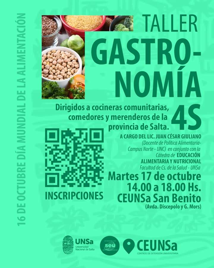 En el marco del Día Mundial de la Alimentación la Secretaria de Extensión invita a participar del Taller “Gastronomía: Soberana, Sana, Segura y Sabrosa” a cargo del Lic. Juan César Giuliano (Política Alimentaria – Campus Norte- Universidad Nacional de Córdoba).