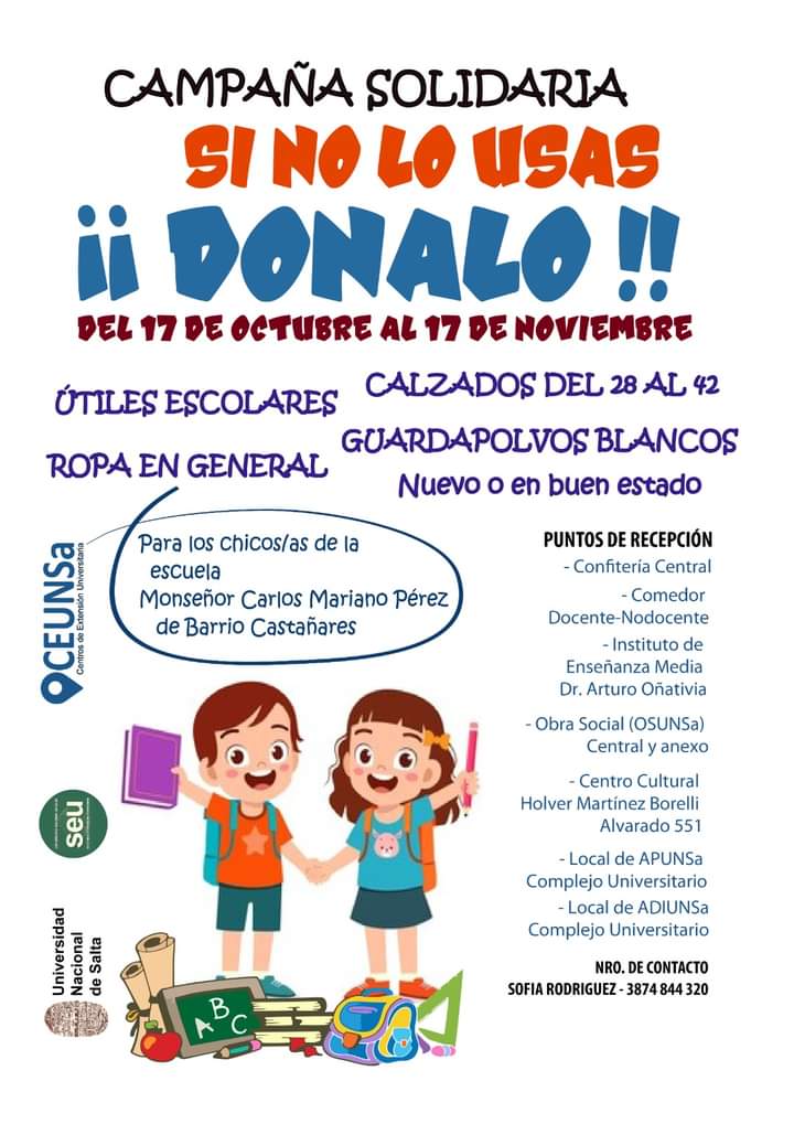 La Secretaría de Extensión de la Universidad Nacional de Salta invita a la comunidad a colaborar con la Campaña Solidaria “Si no lo usas, donalo” para los chicos de la escuela Monseñor Carlos Mariano Pérez de Barrio Castañares.
