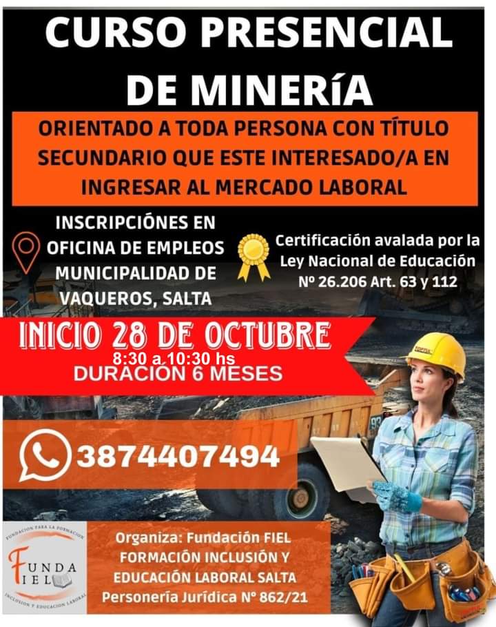 La municipalidad de Vaqueros recuerda a la comunidad que continúa disponible las inscripciones para el curso de minería que iniciará el 28 de octubre de 8:30 a 10:30 horas, el cual tendrá una duración de 6 meses.