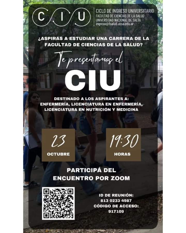 La Universidad Nacional de Salta, y el equipo del Ciclo de Ingreso Universitario de la Facultad de Ciencias de la Salud, invita a los aspirantes de las Carreras de Lic. en Nutrición, Lic. en Enfermería, Enfermería Universitaria y Medicina, a participar del encuentro virtual para presentar el CIU 2024.