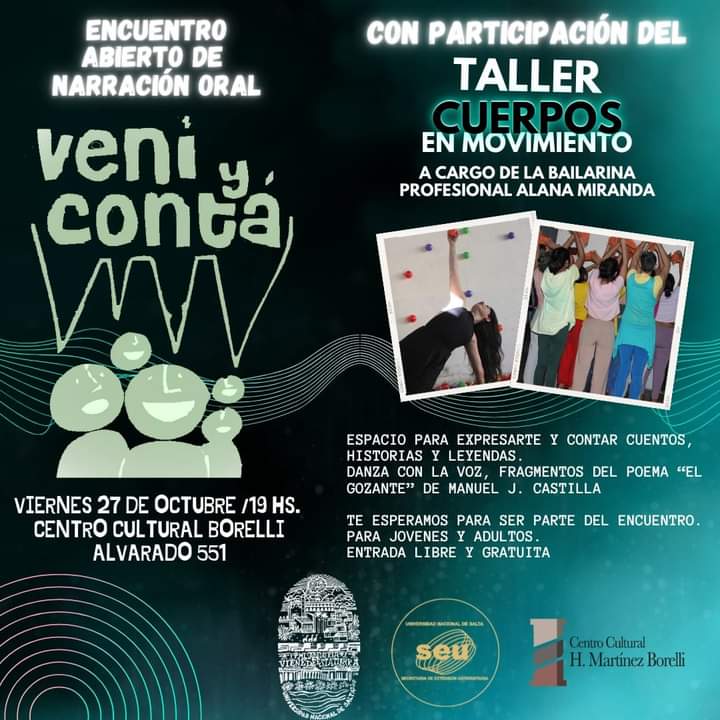 Desde la Secretaria de Extensión Universitaria de la Universidad Nacional de Salta invitan al encuentro de Narración Oral “Vení y Contá” que se realizará con la participación del Taller de Danza Contemporánea “Cuerpos en Movimiento” a cargo de la Bailarina Profesional Alana Miranda.
