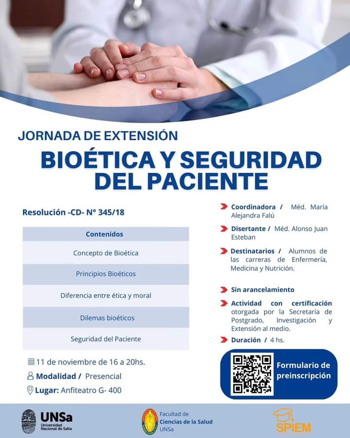 Desde la Facultad de Ciencias de la Salud de la Universidad Nacional de Salta comparten información sobre la Jornada de Extensión denominada “Bioetica y Seguridad del paciente”. La actividad se desarrollará el día 11 de noviembre de 16 a 20 hs en el Anfiteatro G400.