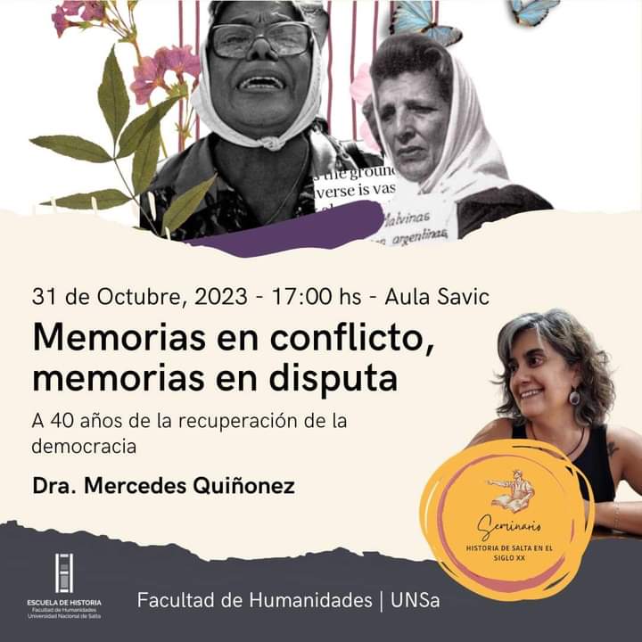 En el marco del Seminario Historia de Salta en el Siglo XX, la escuela de Historia de la Universidad Nacional de Salta invita a participar de la charla “Memorias en conflicto, memorias en disputa. A 40 años de la recuperación de la democracia” a cargo de la Dra. Mercedes Quiñonez. La actividad se llevara a cabo hoy martes 31 de Octubre a las 17 horas en el Aula Savic.