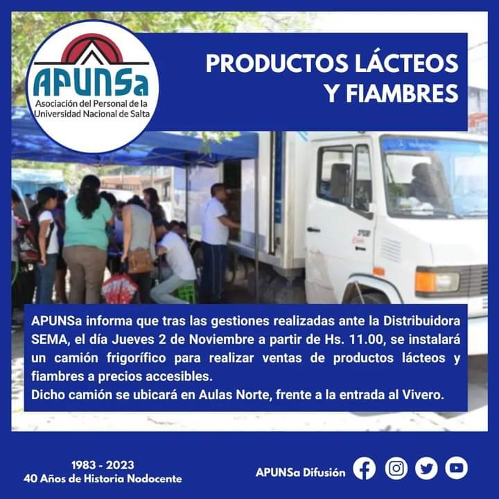 La Asociación del Personal de la Universidad Nacional de Salta (APUNSa) informa que, tras las gestiones realizadas ante la Distribuidora SEMA, el día jueves 2 de noviembre a partir de hs 11 se instalara un camión frigorífico para realizar ventas de productos lácteos y fiambres a precios accesibles.