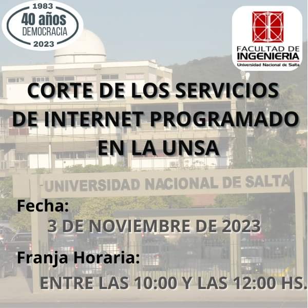 La Facultad de Ingeniería de la Universidad Nacional de Salta informa que el próximo viernes 3 de noviembre del 2023 habrá un corte programado de servicio de internet mañamentre las 10:00 y las 12:00 horas en la UNSa.