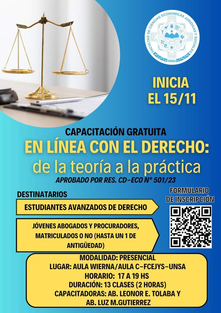 La Facultad de Ciencias Económicas, Jurídicas y Sociales de la Universidad Nacional de Salta invita a la Capacitación gratuita “En línea con el derecho: de la teoría a la práctica”