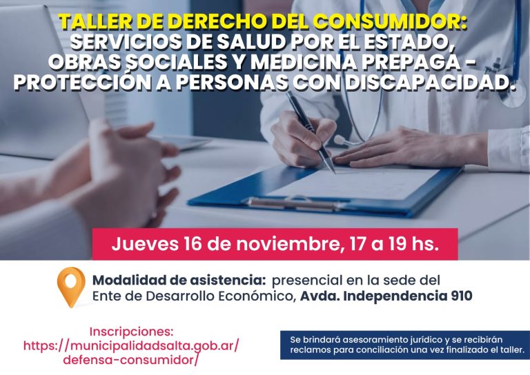 Este jueves 16 de noviembre, de 17 a 19 horas, se realizará en las instalaciones del espacio municipal, de Av. Independencia 910, el taller de Derecho del Consumidor sobre servicios de salud por el estado, obras sociales y medicina prepaga.