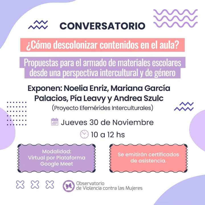 El Observatorio de Violencia contra las Mujeres de la UNSa invita al conversatorio “¿Cómo descolonizar contenidos en el aula? Propuestas para el armado de materiales escolares desde una perspectiva intercultural y de género”.