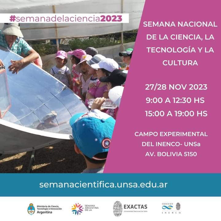 La Universidad Nacional de Salta junto a la Facultad de Ciencias Exactas y el Instituto de Investigaciones en Energía No Convencional, con el financiamiento del Ministerio de Ciencia, Tecnología e Innovación, informan la suspensión de la Semana de la Ciencia, la Tecnología y la Cultura programada para los días 23 y 24 de noviembre en el Campo Experimental del INENCO, sede central de la Universidad Nacional de Salta (Av. Bolivia 5150), debido a condiciones meteorológicas adversas.