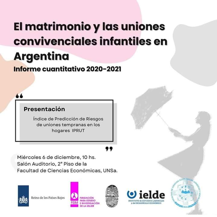 El Instituto de Estudios Laborales y del Desarrollo Económico de la Universidad Nacional de Salta invita a la presentación del Informe cuantitativo 2020-2021 sobre el “Matrimonio y las uniones convivenciales infantiles en Argentina” realizado por la Fundación para estudio e investigación de la Mujer. En este sentido, se dará a conocer el índice de predicción de riesgos de uniones tempranas en los hogares IPRUT.