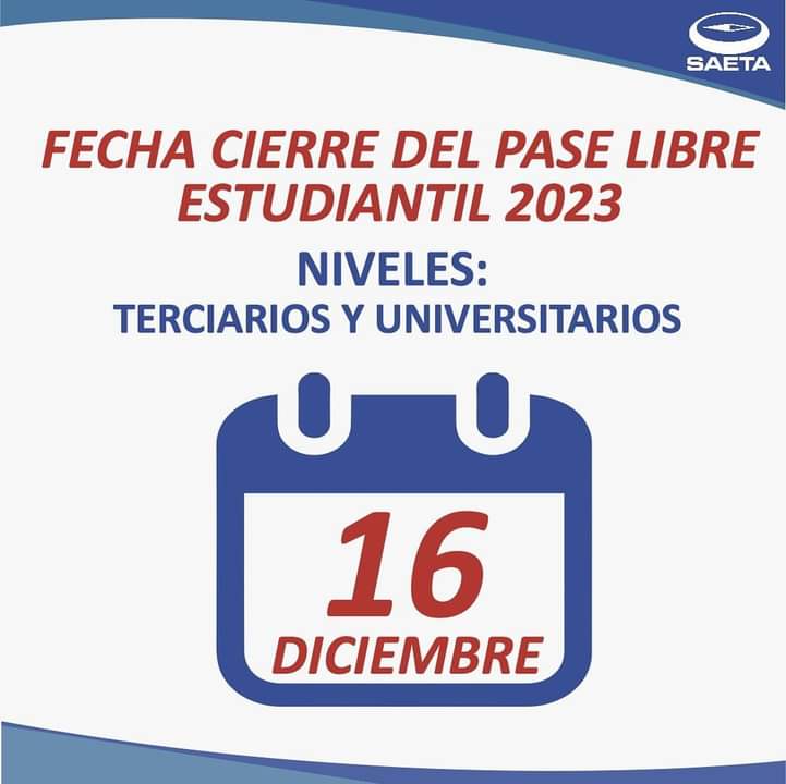 SAETA informa que finalizará la vigencia del Pase Libre para los niveles Terciarios y Universitarios el 16/12.