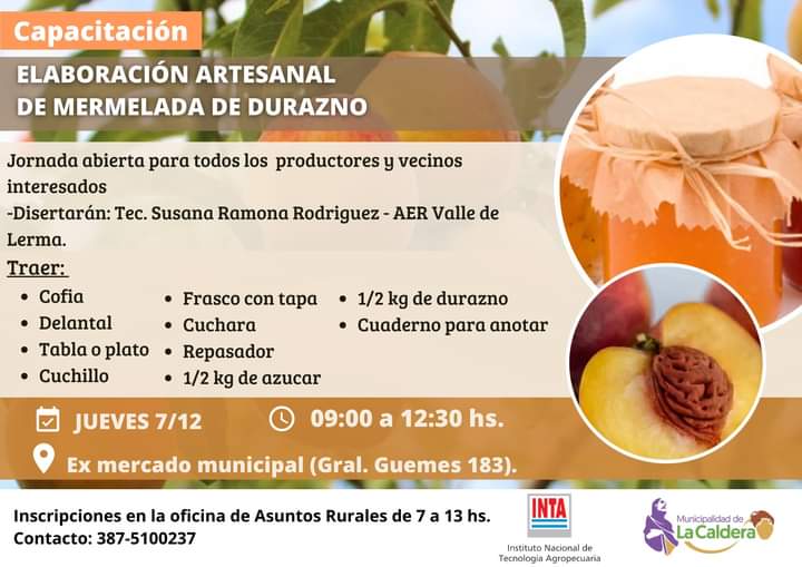 La municipalidad de La Caldera invita a la comunidad a inscribirse a la capacitación para la elaboración artesanal de mermelada de durazno.