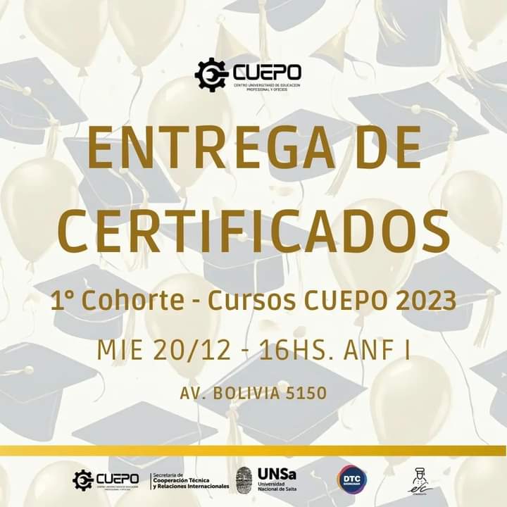 El Centro Universitario de Educación Profesional y Oficios de la UNSa (CUEPO) invita a Estudiantes, Capacitadores, Autoridades y Publico en General, a la Entrega de Certificados de la Primera Cohorte de Graduados.