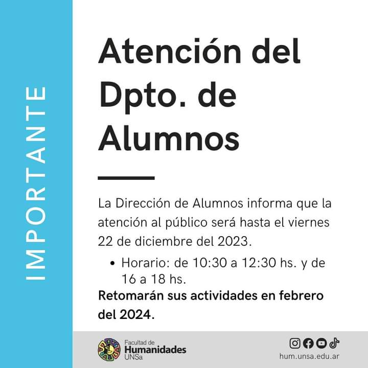La Dirección de Alumnos de la Facultad de Humidades de la Universidad Nacional de Salta informa que la atención al público será hasta el viernes 22 de diciembre del 2023.