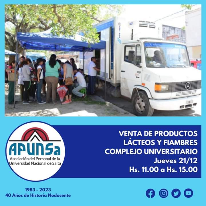 La Asociación del Personal de la Universidad Nacional de Salta (APUNSa) informa que, tras las gestiones realizadas ante la Distribuidora SEMA, en el día de hoy jueves 21 de diciembre a partir de las 11 hs. Se instalaran nuevamente camiones frigoríficos para realizar ventas de productos lácteos y fiambres a precios accesibles.
