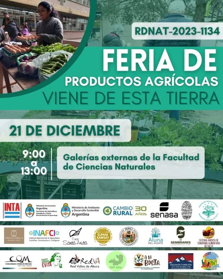 La Facultad de Ciencias Naturales invita hoy jueves 21 de diciembre, a la nueva edición de la Feria de Productos Agrícolas “Viene de esta Tierra”.