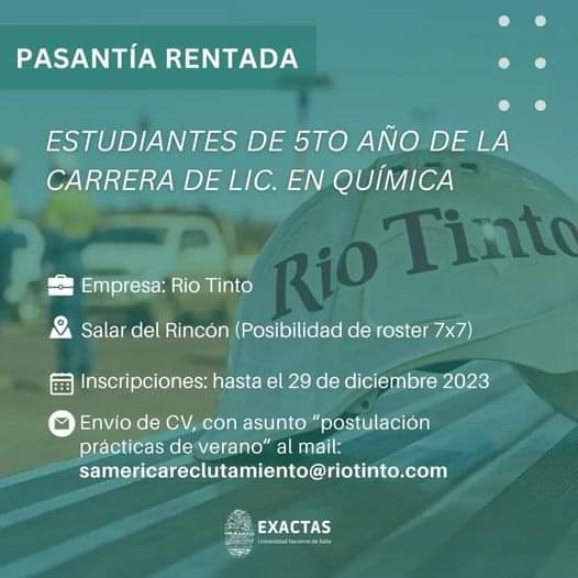 La Facultad de Ciencias Exactas de la Universidad Nacional de Salta comparte información de la pasantía rentada brindada por la empresa Rio Tinto para estudiantes de 5to Año de la carrera de Licenciatura en Química.