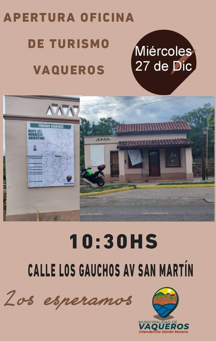 La municipalidad de Vaqueros bajo la intendecia del intendencia de Daniel Moreno informan a la comunidad que se realizará un acto de apertura de la oficina de turismo de Vaqueros.