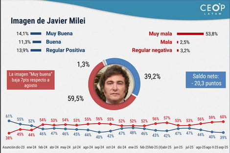 El gobierno de Javier Milei transita un deterioro más bien dramático: su imagen positiva rompió hacia abajo la barrera del 40 por ciento de aprobación (39 por ciento), algo que no ocurrió en los 21 meses que lleva de gestión, con un agregado de que el 53,4 por ciento califica su desempeño como muy malo. Emerge algo que no se parece a disconformismo sino a bronca. Un punto clave de la situación es que se derrumbaron de forma catastrófica las expectativas económicas: apenas el 27,5 por ciento de los ciu la economía del país en los últimos dos meses la caída fue de 19 puntos