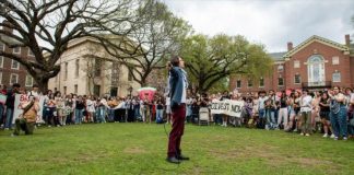 Estudiantes realizan una manifestación a favor de Palestina en el campamento...